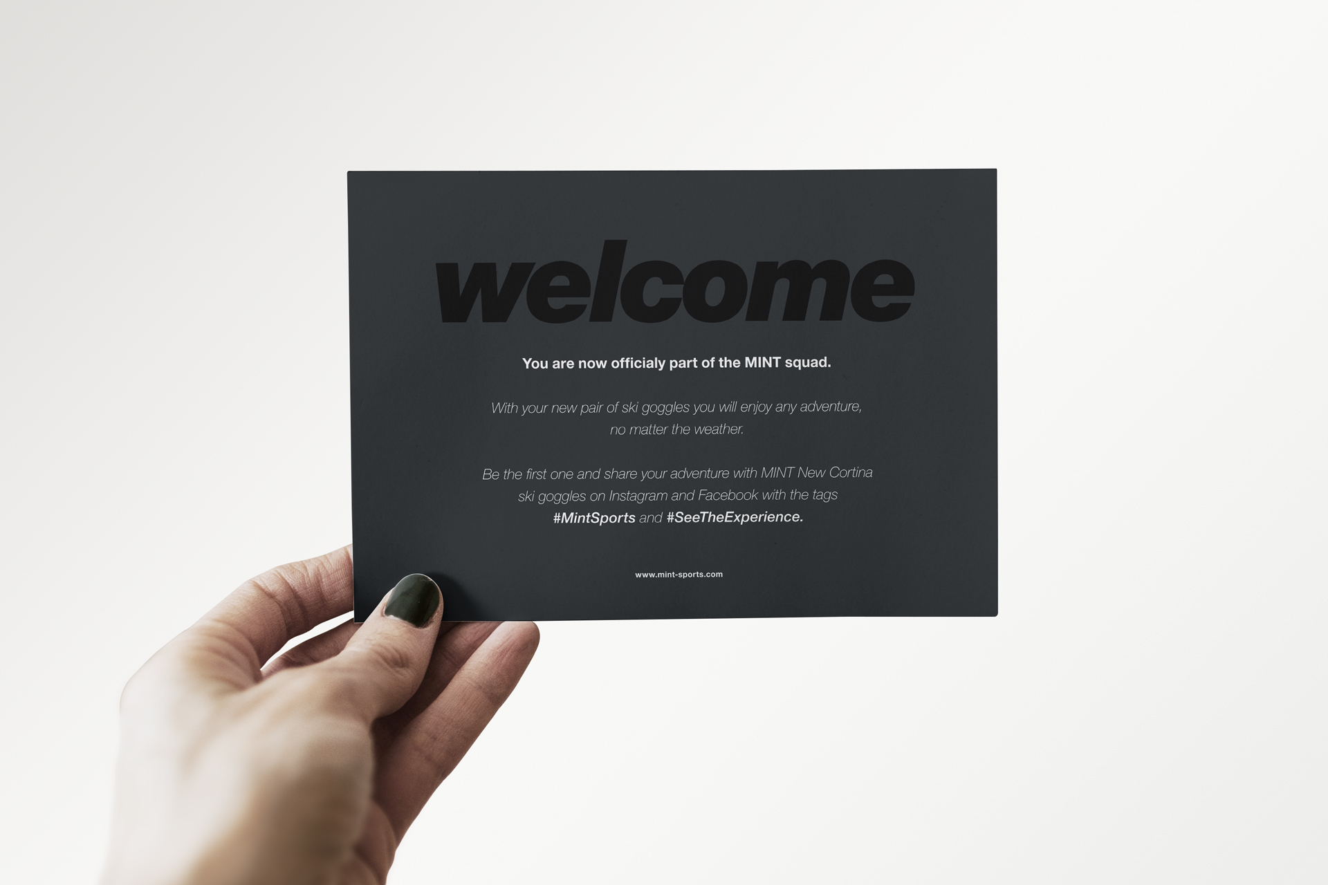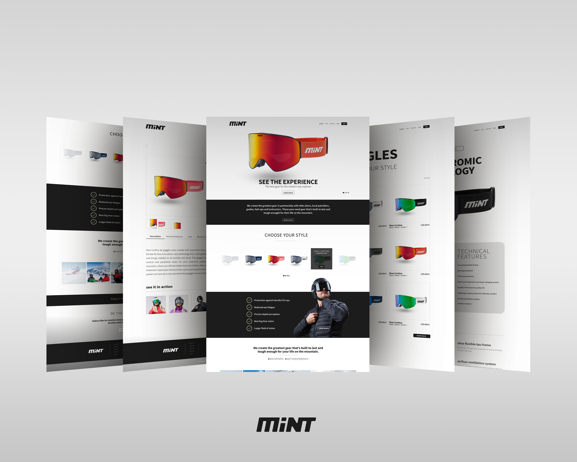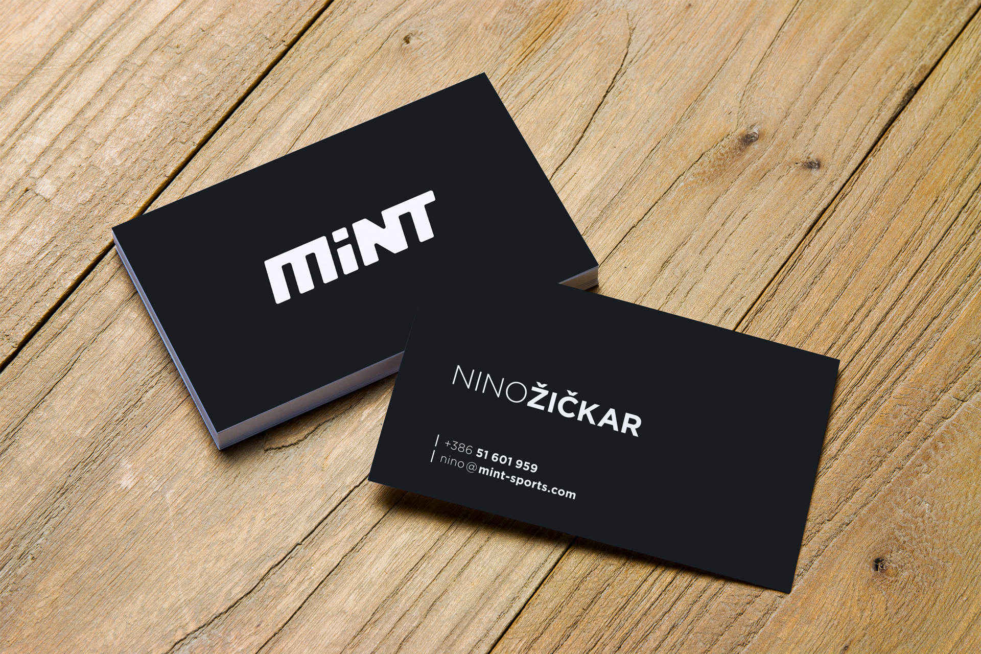 Oblikovanje celostne grafične podobe za MINT sports; logotip, vizitke, aplikacije na očala, embalaža, spletna stran .. // Visual identity for MINT sports – logo, business cards, cards, box, website, goggles ..